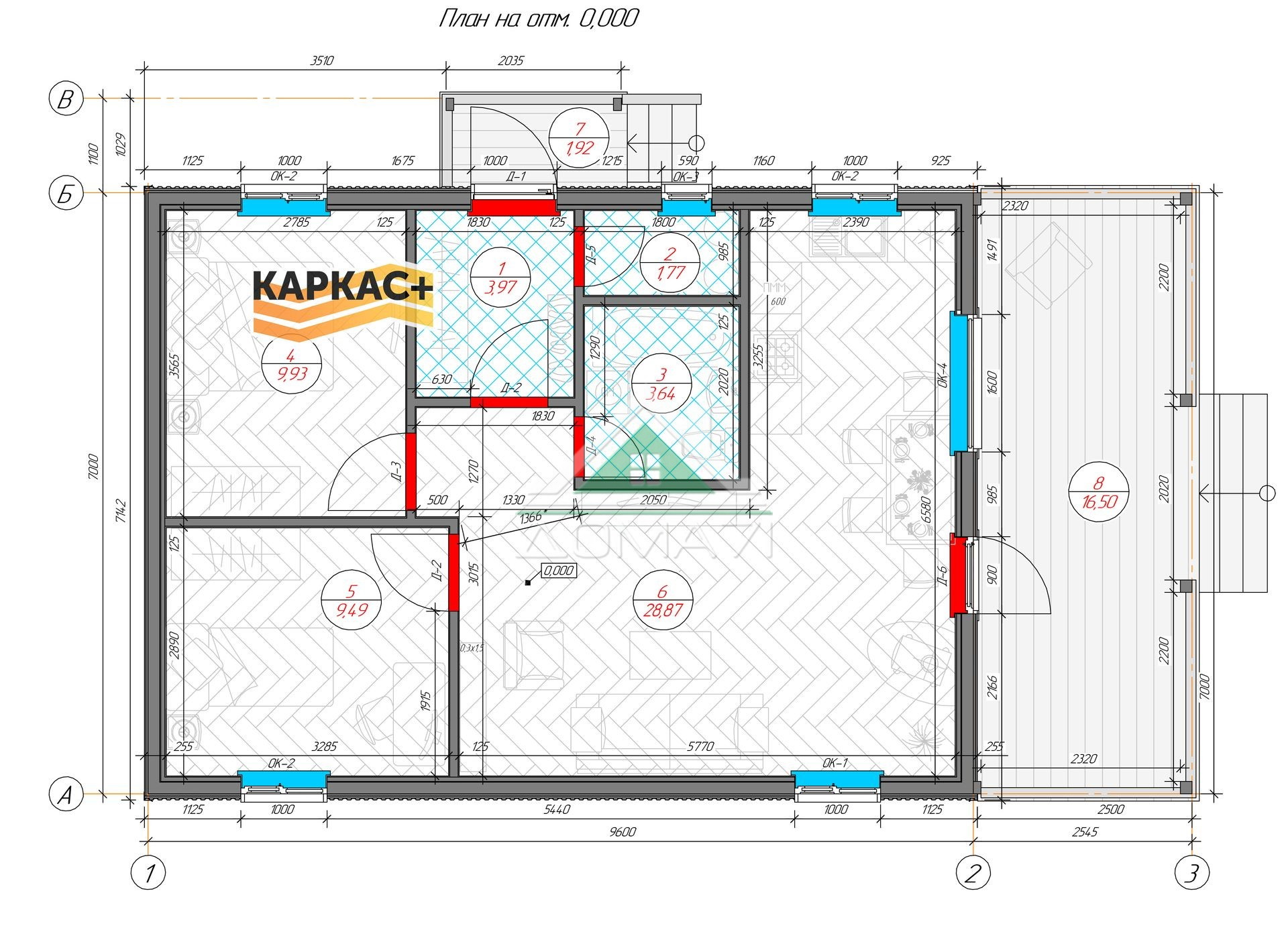 Отделка стен: ОСП 9мм Имитация бруса сорта АВ 16х135 мм, возможна замена на другой тип отделки Имитация бруса сорта АВ 20х135 мм, возможна замена на другой тип отделки